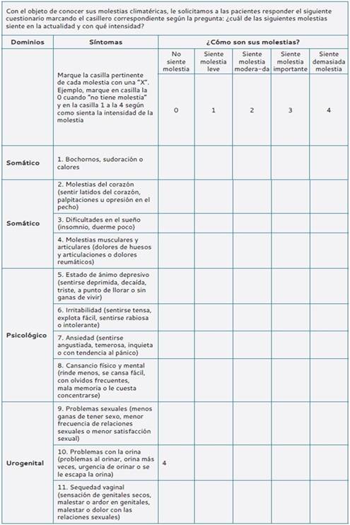 La escala MRS es un cuestionario autoadministrado para cuantificar la calidad de vida en la menopausia y lo integran once ítems (síntomas), divididos en tres subescalas o dominios: (A) somática-vegetativa: sofocos, molestias cardiacas, trastornos del sueño, molestias musculares y de las articulaciones (ítems 1, 2, 3, 11, respectivamente); (B) psicológica: estado de ánimo deprimido, irritabilidad, ansiedad, cansancio físico y mental (ítems 4, 5, 6, 7, respectivamente); y (C) urogenital: problemas sexuales, de vejiga y sequedad de la vagina (ítems 8, 9, 10, respectivamente) (tabla 2). Los ítems se califican como: “0” (ausente), “1” (leve), “2” (moderado), “3” (severo) y “4” (muy severo) (10, 16). El puntaje de un dominio corresponde a la sumatoria de los valores obtenidos de cada ítem y el puntaje total será la sumatoria de los puntajes obtenidos de cada dominio (10).