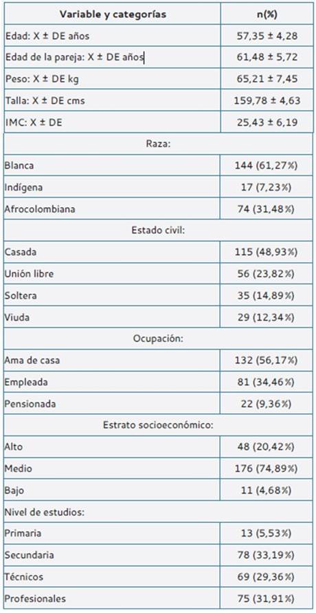 Sociodemográficas (edad, estado civil, raza, estrato socioeconómico, origen, nivel de estudios, ocupación, religión, peso, talla e índice de masa corporal (IMC)), afiliación al sistema general de seguridad social en salud en Colombia, antecedentes ginecobstétricos, edad de la menopausia, mediana del tiempo transcurrido de la menopausia, hábitos (ingesta de alcohol, sedentarismo o tabaquismo), antecedentes patológicos, variables de comportamiento sexual (sexo oral, masturbación, coito vaginal o anal y frecuencia de relaciones sexuales mensuales), tiempo de convivencia en pareja y calidad de vida a través de diversos elementos contenidos en el SF-36 y la MRS; adicionalmente, se consideró el análisis de la proporción de la severidad de la sintomatología por subgrupos de edad (40 a 49, 50 a 59, 60 a 69 y ≥ 70 años) para establecer una comparación de su comportamiento por cada década de vida.