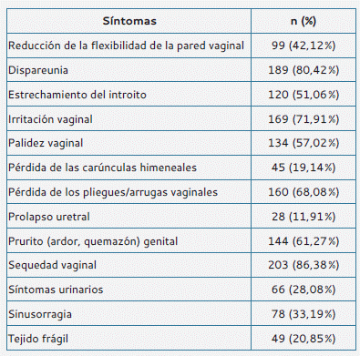 En la tabla 4 se detalla la sintomatología referida por las pacientes. El 68,93 % presentó cuatro o menos síntomas, el 17,87 % cinco y el 13,19 % seis o más síntomas, con una mediana de 4 (rango entre 2 y > 8), donde los síntomas vulvo- vaginales fueron los más frecuentes (67,65 %).