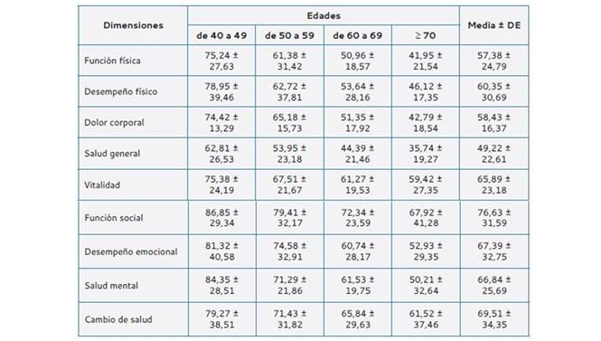 En el cuestionario SF-36, la dimensión “salud general” (42,81 ± 26,53) notificó la puntuación más inferior, seguida por la “función física” (52,17± 23,89) (tabla 5). Se encontraron diferencias por grupos de edad en las puntuaciones, siendo mayor en las menores de 50 años y menor en las mayores de 70 años (p = 0,003). Las dimensiones “vitalidad” y “función física” resultaron ser las más afectadas (p = 0,001) entre las mayores de 70 años y las mujeres con dos o más comorbilidades arrojaron un mayor deterioro en la “función física” y el “desempeño emocional”.