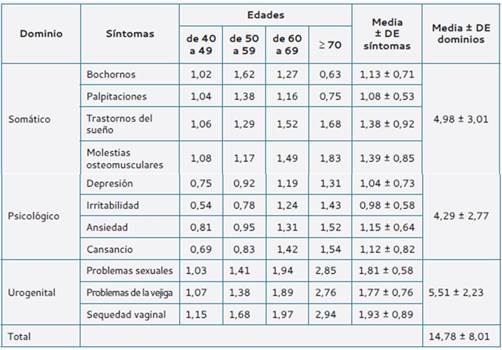 Los síntomas que muestran mayor severidad son los del dominio urogenital, con un promedio de 5,51 ± 2,23 puntos, con una media de 1,84 ± 0,74 puntos en cada pregunta de dicho grupo de síntomas, seguido del dominio somático con 4,98 ± 3,01 puntos, con un promedio por pregunta de 1,24 ± 0,75 puntos. El dominio con menor impacto sintomático fue el psicológico, con 4,29 ± 2,77 puntos y un promedio de 1,07 ± 0,69 puntos por pregunta.