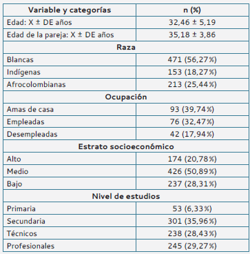 En los antecedentes gineco-obstétricos, la edad promedio de la menarquia fue a los 13,67± 1,48 años (mínimo 11 y máximo 19) y la edad media de inicio de la actividad sexual fue a los 17,92 ± 2,57 años (mínimo 16 y máximo 23); la mediana en el número de embarazos fue de 3 (rango entre 0 y 7), en la paridad fue de 2 (rango entre 0 y 5), en el número de abortos fue de 2 (rango entre 0 y 4); la infertilidad primaria se hizo presente en el 32,85 % (n = 275/837) de las participantes, el uso de métodos anticonceptivos (no hormonales) se detectó en el 42,89 % (n = 359/837).