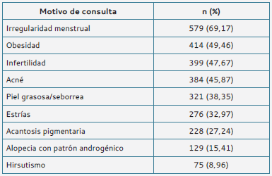 El principal motivo de consulta fue la irregularidad menstrual (69,17 %), seguida de la obesidad (49,46 %) e infertilidad (47,67 %) (tabla 3).