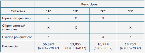 De acuerdo con los criterios de Rotterdam (3), se han descrito cuatro fenotipos clínicos del SOP: fenotipo “A” (oligoanovulación+hiperandrogenismo o hiperandrogenemia + ovarios poliquísticos), fenotipo “B” (oligoanovulación+ hiperandrogenismo o hiperandrogenemia), fenotipo “C” (hiperandrogenismo o hiperandrogenemia + ovarios poliquísticos) y fenotipo “D” (oligoanovulación + ovarios poliquísticos) (tabla 1).