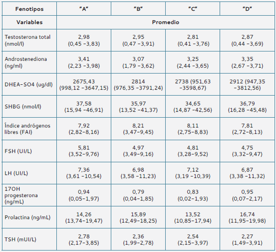 Con respecto a la presencia de los diferentes fenotipos, estos se clasificaron como fenotipo “A” 56,39 %, fenotipo “B” 13,85 %, fenotipo “C” 10,99 % y fenotipo “D” 18,75 % (tabla 4). El 13,85 % de las mujeres participantes no presentaron ovarios poliquísticos en el estudio ecográfico transvaginal, el 18,75 % no reportó hiperandrogenismo (tabla 4).
