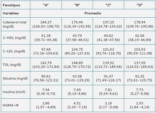 La tabla 6 describe los perfiles metabólicos y el valor de HOMA-IR de los cuatro fenotipos de las mujeres con SOP.