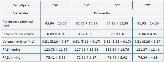 La tabla 7 detalla las características antropométricas, el volumen ovárico y las cifras tensionales de los cuatro fenotipos de las mujeres con SOP.