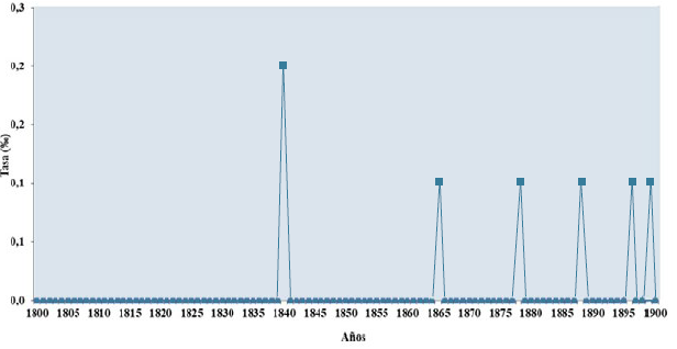 Figura 1: Evolución de la Tasa Bruta de Mortalidad Específica para Enfermedades Endocrinológicas en Jerez de los Caballeros (Bajadoz, España) durante el siglo XIX