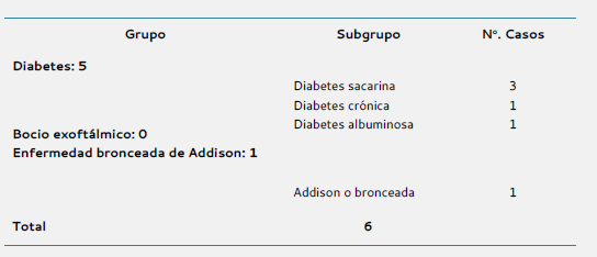 En la tabla 1 se contemplan los distintos motivos de defunción, enclavados dentro de las patologías endocrinológicas, siendo la diabetes la más importante con cinco óbitos.