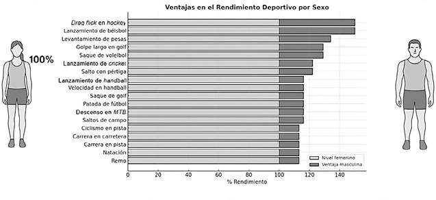 El tipo de actividad deportiva también es relevante al momento de evidenciar las diferencias en el rendimiento deportivo, si bien en la mayoría de competencias élite se evidencia una ventaja para los hombres cisgénero, las brechas se agrandan cuando se tratan de actividades que involucran predominantemente el tren superior; en actividades como saque de tenis, golf y voleibol, las diferencias en rendimiento superan el 20,0 % en favor de los hombres y pueden alcanzar hasta el 50,0 % en actividades como lanzamiento en béisbol (46); mientras que disciplinas como el ciclismo, el atletismo y la natación mostraron diferencias menos significativas, tal como se muestra en la figura 1.