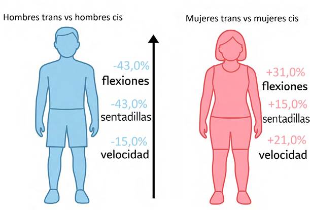 Algunos estudios sugieren que, tras la reducción de la testosterona, las atletas transgénero pierden gran parte de su ventaja física inicial en términos de fuerza y resistencia, aunque todavía pueden mantener algunas diferencias fisiológicas en comparación con las atletas cisgénero (mujeres cuyo sexo asignado al nacer es femenino); así mismo se ha planteado si la suplencia con testosterona en hombres trans es capaz de equiparar su rendimiento deportivo con el de los hombres cis. Uno de los estudios que trató de responder esta interrogante fue el publicado por Roberts et al. en 2021, el cual evaluó el rendimiento de 29 hombres trans y 46 mujeres trans en tres ejercicios (sentadillas en un minuto, flexiones y carrera de 1,5 millas) antes y 12 meses después de iniciar la terapia hormonal y con respecto a sus pares cisgénero, los resultados revelaron que las mujeres trans realizaron un 31,0 % más de flexiones y un 15,0 % más de sentadillas en un minuto, y fueron un 21,0 % más veloces; sin embargo, después de dos años de terapia hormonal, desapareció la brecha tanto en flexiones como en sentadillas, pero las mujeres trans permanecieron un 12,0 % más veloces (48). En este mismo estudio, los hombres trans realizaron un 43,0 % menos flexiones y sentadillas, y fueron un 15,0 % más lentos, dichos resultados se representan en la figura 2. Además, después de un año de hormonas masculinas, no se observaron diferencias en flexiones ni en velocidad con respecto a los hombres cisgénero. En el año 2023 se presentaron resultados similares en el estudio realizado por Chiccarelli et al., el cual evaluó el rendimiento deportivo de 346 personas transgénero pertenecientes a la fuerza aérea y lo comparó con una cohorte cisgénero de edad similar, las mediciones se realizaron antes de la terapia y hasta cuatro años después de haberla comenzado. Se reportó que luego del inicio de la THAG, los hombres transgénero mejoraron su rendimiento en todas las categorías, en consistencia con los efectos anabólicos de la testosterona; mientras que en el caso de las mujeres trans, se demostró que al comienzo de la terapia su rendimiento había disminuido y, al finalizar el seguimiento, no había diferencia en sentadillas ni en velocidad, pero se mantenían más fuertes en su capacidad para las flexiones de pecho con respecto a sus homólogas cisgénero (49).